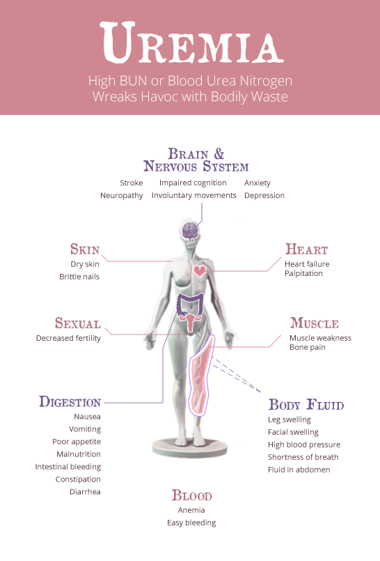 The gradual decline in kidney function is initially asymptomatic. A renal failure progresses the kidneys have a harder time removing excess solutes (sodium, potassium, phosphorus), fluid, acid (hydrogen ions) and blood urea nitrogen. Retention of BUN results in a clinical state called ‘uremia’. Manifestations of this include fatigue, weakness, nausea, poor appetite, reduced concentration, confusion and lethargy. There is not a specific BUN number after which symptoms start to develop. It varies amongst different individuals. If one is uremic they would require a form of renal replacement therapy such as hemodialysis, peritoneal dialysis, or renal transplantation.